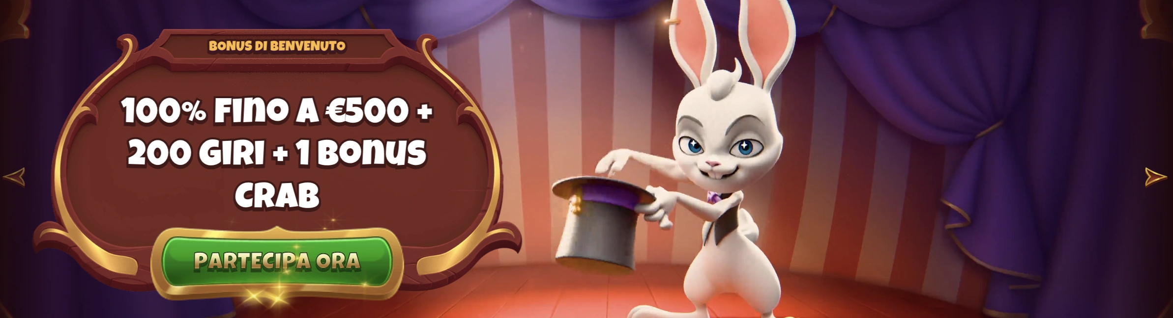 I nuovi giocatori ricevono un bonus del 100% fino a €500 sul primo deposito, più 200 giri gratuiti e 1 Bonus Crab. Deposito minimo: €20. I fondi devono essere giocati 35x; le vincite da giri gratis hanno requisito 40x. La puntata massima con fondi bonus è €5.